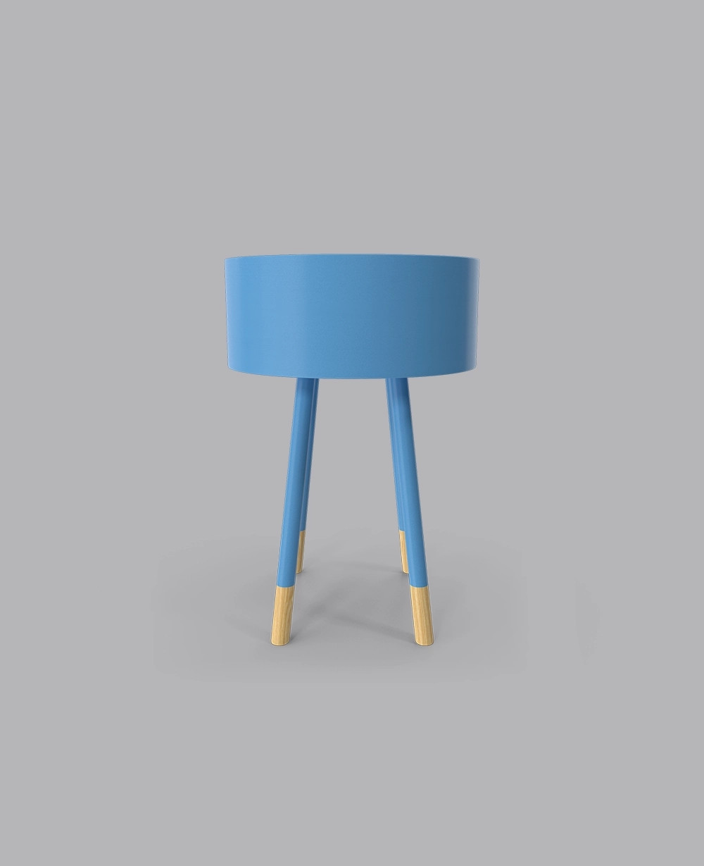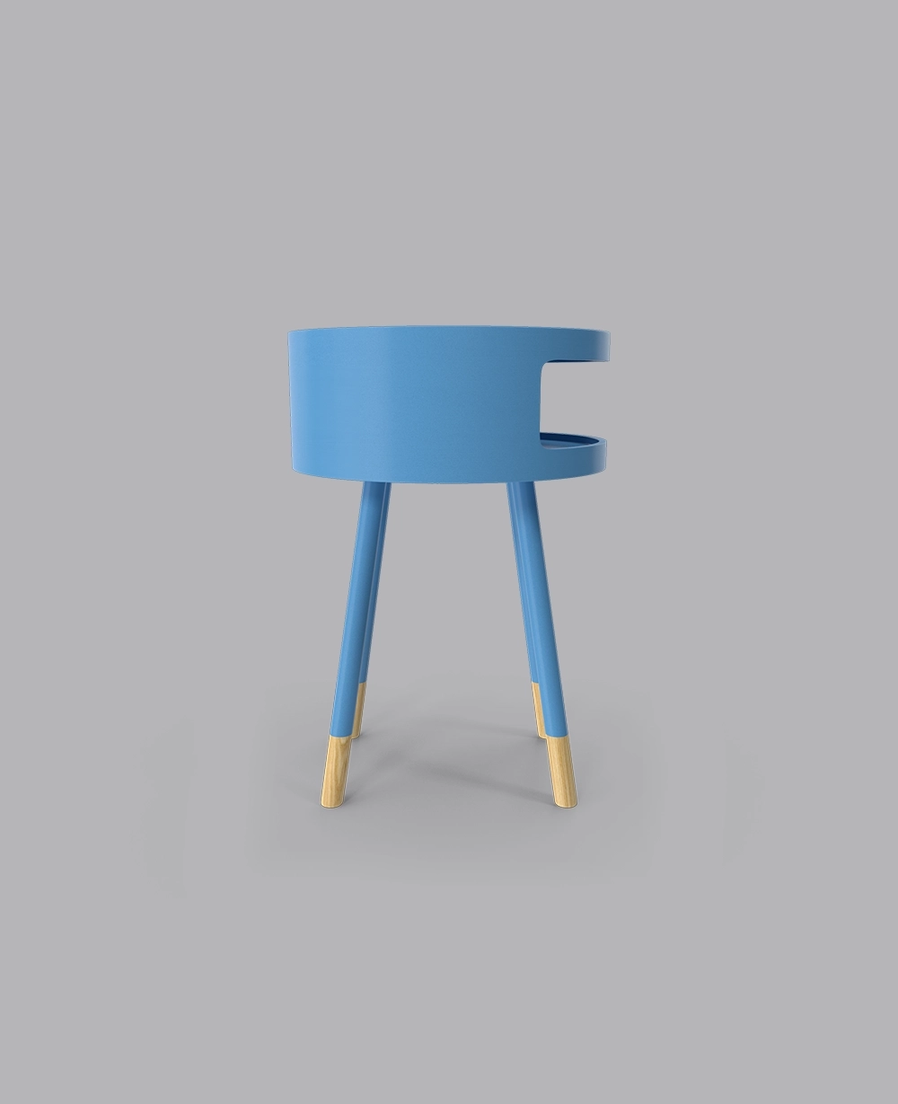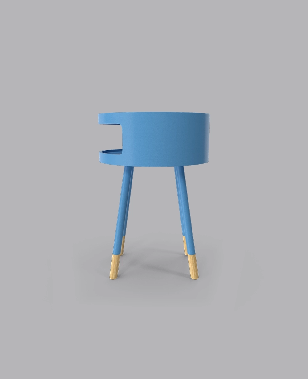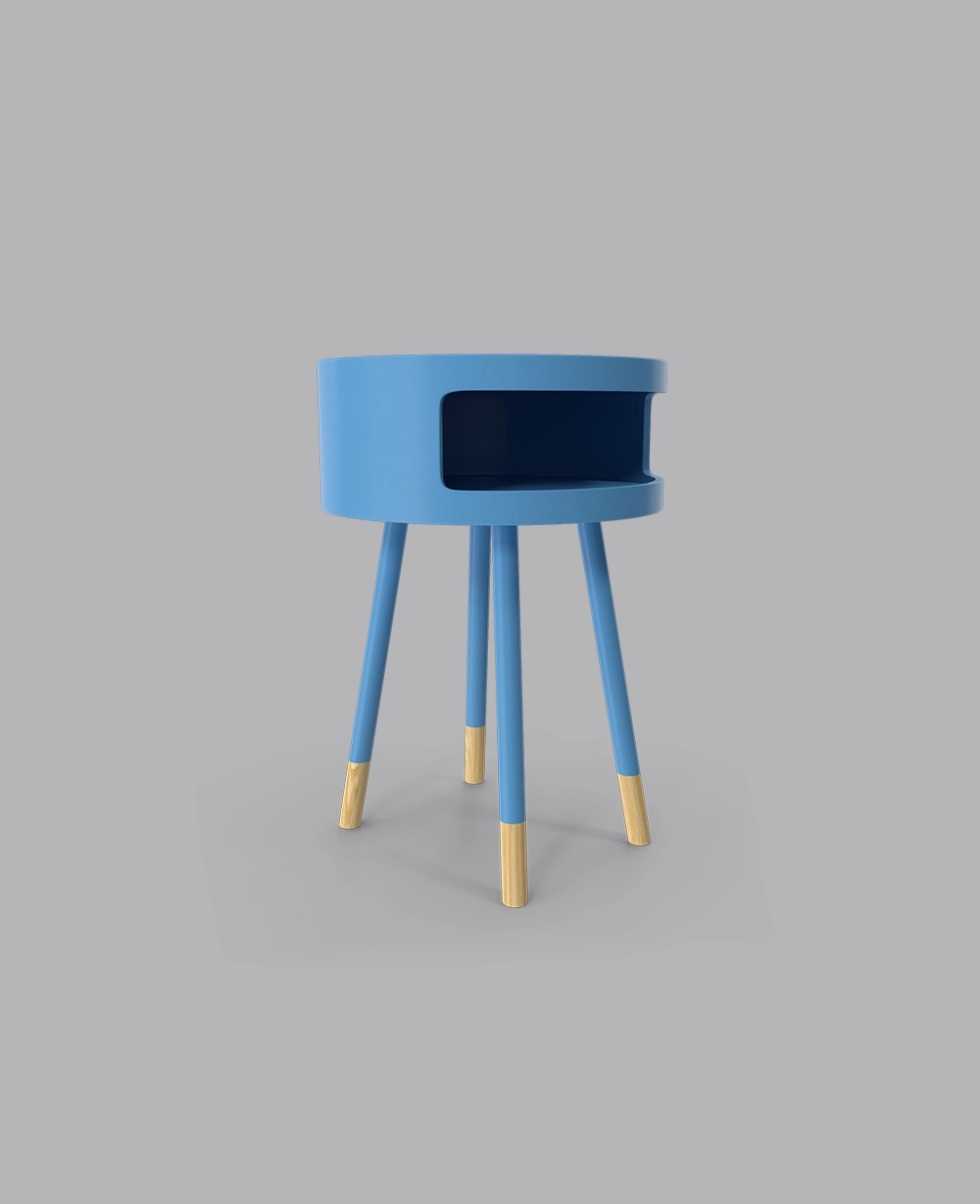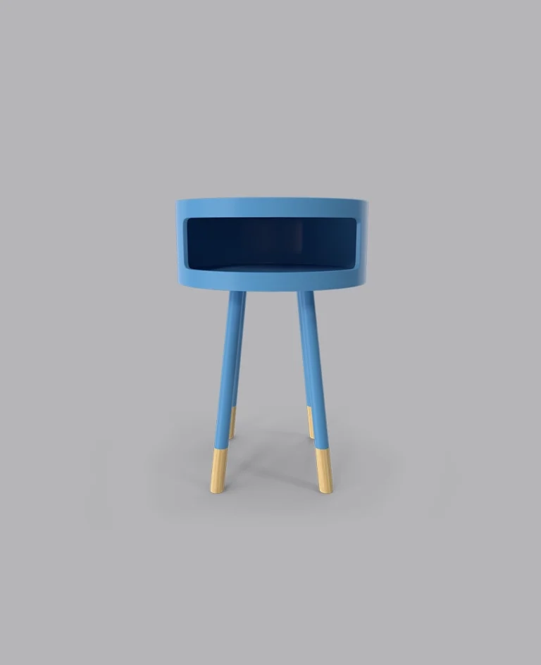 The Sky Table combines vibrant blue color with natural wood accents, offering a compact and stylish design with an open storage compartment for modern spaces.