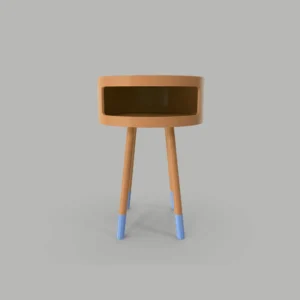 The Sky Table combines vibrant blue color with natural wood accents, offering a compact and stylish design with an open storage compartment for modern spaces.